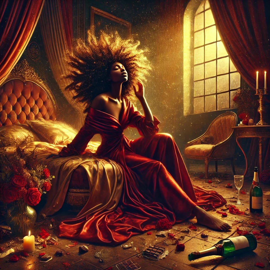 Love arose from her divan, glorious in the splendor of her righteous indignation. "The humans beseech me night and day” Love raged. “Looking for me outside of themselves, seeking partnership, searching to add meaning to their finite, painful lives. I am the ultimate power in existence, yet the mortals beg and whimper for my attention as if they deserve me?”