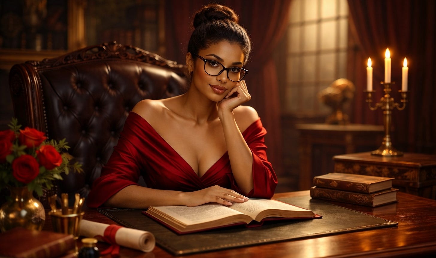 The Goddess of Love sat behind an enormous mahogany desk: hair in a bun, no makeup, horn-rimmed glasses clinging to the bridge of her nose. The servants which normally attended her were noticeably absent.